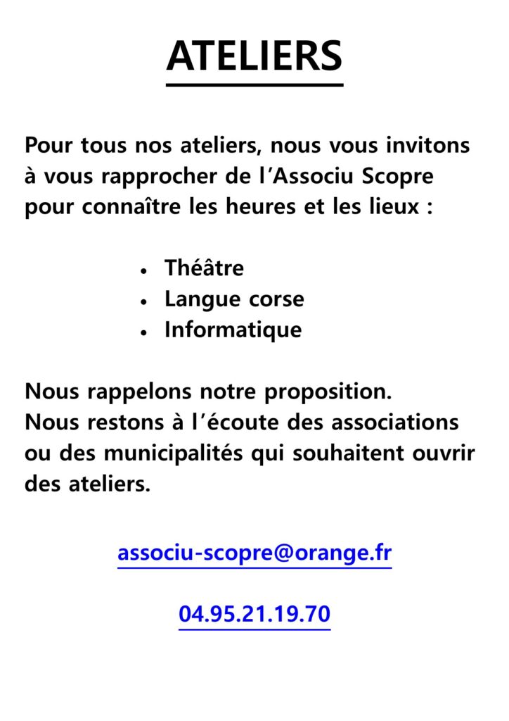 Pour tout renseignement concernant nos ateliers, nous vous invitons à contacter l’association afin de connaître les horaires et les lieux.